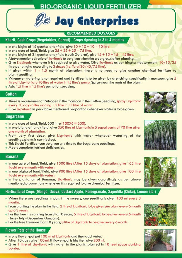 The dose of Liquitonic is 75 liters per acre. To be given in three batches of 25 liters each for any crop/ vegetables with crop-cycle of approximately 60 to 90 days. It covers the total nutritional requirement of the crop hence no other fertilizer is required to be added or applied. We attach the brochure for your perusal.